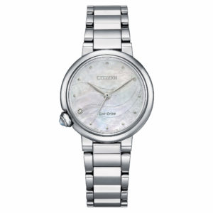 Cassa e bracciale in acciaio. Quadrante in madreperla. Vetro zaffiro. WR 5 bar.