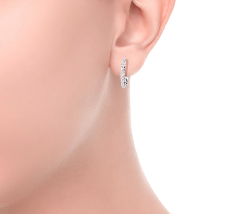 Orecchini a cerchio in oro bianco 18 kt e diamanti taglio brillante (diametro cm. 1).